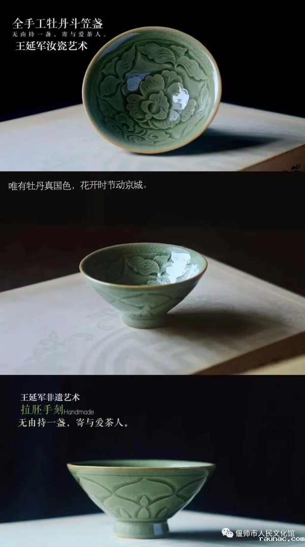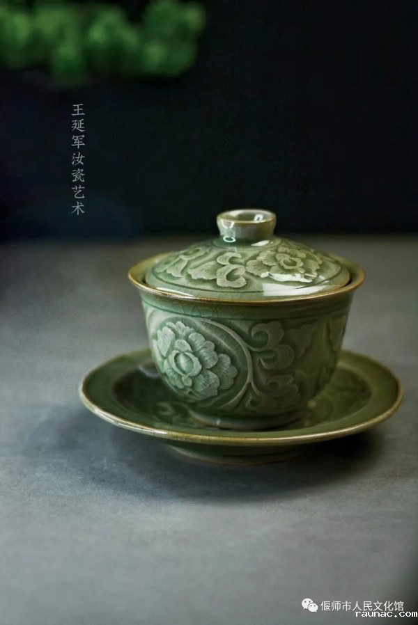 汝瓷刻花技艺,是将搜集、整理的宋汝瓷刻花残片复原之后的百余种图案,严格按照传承、改良后的宋代传统手法,雕刻于手拉泥胚,施以由天然矿物釉,高温烧至1300度,使宋汝瓷刻花碗盘完整再现。