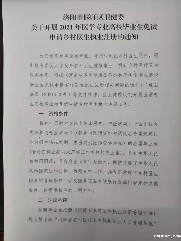 洛阳市hth登录网页入口卫健委 关于开展2021年医学专业高校毕业生免试申请乡村医生执业注册的通知