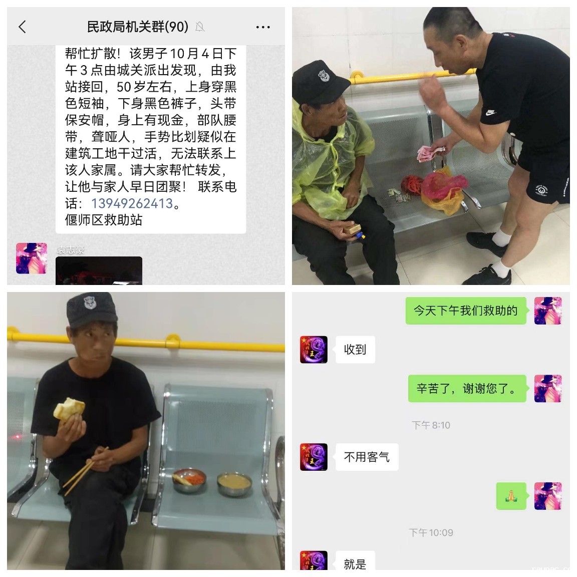 10月4日下午3点左右,通过洛阳市铁路公安联系,在偃师火车站售票大厅有一名男性聋哑人,找不到回家的路。接到求助电话后,救助管理站工作人员立即前往了解情况。因本人无法与人正常交流,为其安全着想,先将做核酸检测后,再带回站里安置。随后通过公安部门人脸识别、今日头条寻亲、朋友圈儿转发等各种渠道获知这名男子的详细信息,为河南省汝州市蟒川镇任庄村朱园村7组村民,同他的家人取得联系后,本人表示想返回家乡。我们速速与其户籍所在地救助站联系,于10月6日上午将本人安全护送回家。