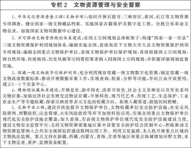 实施文物平安工程,加大古遗址、古墓葬、石窟寺石刻等防盗窃盗掘预警技术研发应用和相关装备配置力度。加强博物馆和文物建筑等火灾防控、洪涝监测预警、地震和地质灾害防控信息技术应用和应急管理体系建设。加强卫星遥感、无人机、大数据等科技手段在文物安全监测和执法督察中的应用。