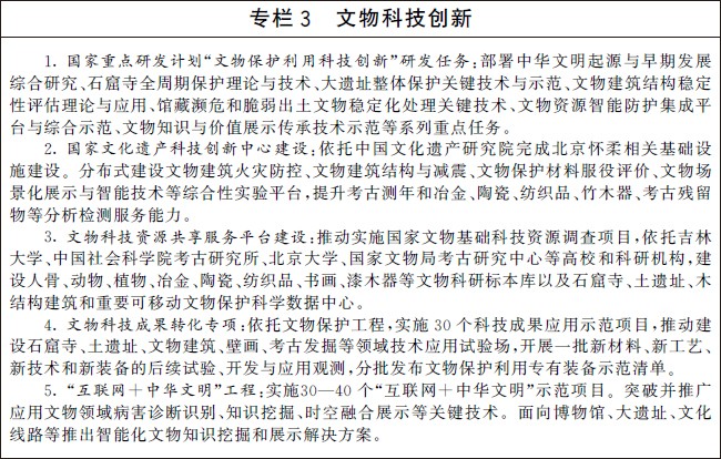 坚持科技创新引领,遵循文物保护和考古特点规律,加大要素投入力度,优化资源配置,加强多学科协同,构建产学研用深度融合的文物科技创新体系,推进行业标准体系建设,提升文物科技创新能力和文物领域科技应用水平,带动解决重点难点和瓶颈问题,支撑引领文物事业高质量发展。