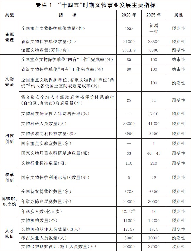 到2025年,文物安全形势明显好转,文物保护水平全面提升,文物科技创新能力实现跃升,文物机构队伍力量增强、结构优化,文物领域社会参与活力不断焕发,文物治理体系和治理能力现代化初步实现。中国特色、中国风格、中国气派的考古学建设持续推进,文物蕴含的中华文化基因得到更好挖掘阐释。革命文物保护管理运用体系基本健全,重要作用得到更好发挥。布局合理、结构优化、特色鲜明、体制完善、功能完备的博物馆体系初步形成,博物馆发展质量显著提升。社会文物管理服务更加优化,文物市场健康有序发展。文物工作在坚定文化自信、扩大中华文化影响力、铸牢中华民族共同体意识方面的重要作用愈加彰显,文物保护成果更好惠及人民群众。形成资源管理全覆盖、法律法规更完备的文物保护利用体系,走出一条符合国情的文物保护利用之路。