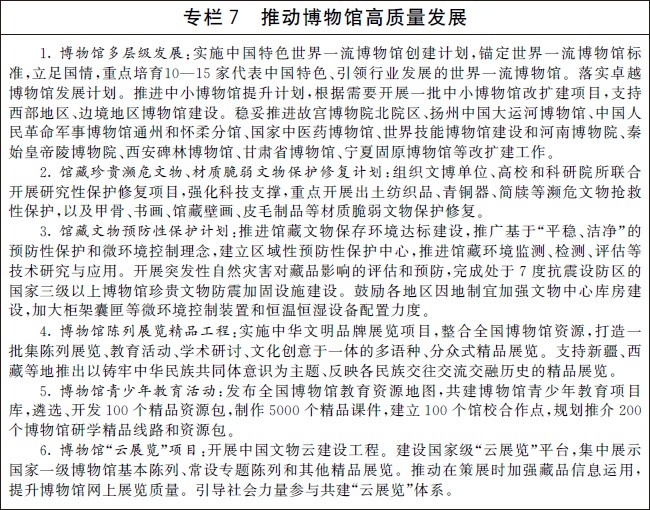 实施中国特色世界一流博物馆创建计划。支持省级、重要地市级博物馆特色化发展。盘活基层博物馆资源。探索建立行业博物馆联合认证、共建共管机制。规范和扶持非国有博物馆发展,落实支持政策,依法依规推进非国有博物馆法人财产权确权。认真履行相关审批程序,有序推动建设一批反映党和国家建设成就的当代主题博物馆和行业博物馆,重点支持建设反映中华文明发展历程的国家级重点专题博物馆,倡导建设特色专题博物馆。探索在文化资源丰厚地区建设“博物馆之城”。