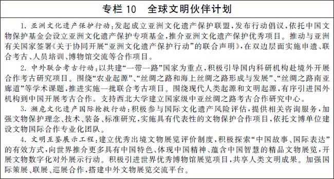 编制并实施“十四五”考古工作专项规划。系统确定考古发掘重点,深化中华文明探源工程,推进“考古中国”重大项目,科学阐释中国境内人类起源、文明起源、中华文明形成、统一多民族国家建立和发展、中华文明在世界文明史中的重要地位等关键问题,揭示中华文明的历史文化价值和核心特质。