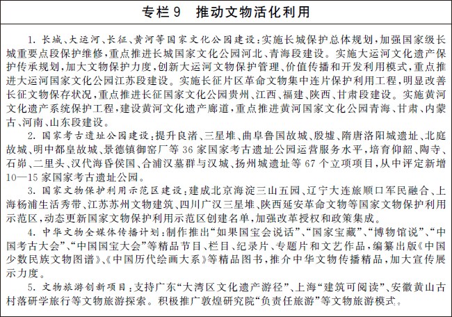 创新文物保护利用机制,加强文物和文化遗产保护利用,建设国家文物保护利用示范区。健全国有文物资源资产管理制度,推进文物资源资产管理信息共享,部署开展相关试点工作。完善各方主体参与文物保护利用的支持政策,保障利益相关方合法权益。探索创新对文物资源密集区的支持方式。建设文物领域国家智库。