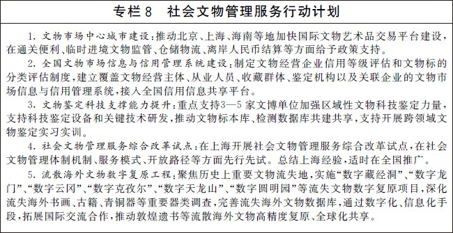 坚持社会效益优先,加强对民间收藏的指导、管理和服务,健全文物合法流通交易体制机制,优化文物鉴定服务和文物进出境监管,完善流失文物追索返还制度。