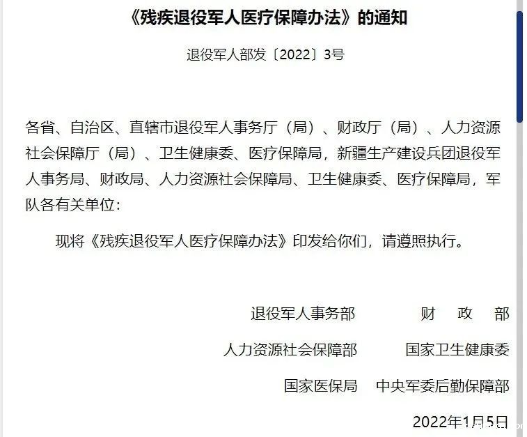 近日,退役军人事务部、财政部、人力资源社会保障部、国家卫生健康委员会、国家医保局、中央军委后勤保障部等6部门近日联合印发《残疾退役军人医疗保障办法》。