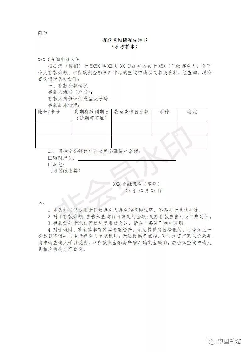 根据《关于简化查询已故存款人存款相关事宜的通知》: 已故存款人的配偶、父母、子女凭已故存款人死亡证明、可表明亲属关系的文件,如居民户口簿、结婚证、出生证明等,以及本人有效身份证件,公证遗嘱指定继承人、公证遗嘱受益人凭已故存款人死亡证明、公证遗嘱及本人有效身份证件,可单独或共同向开户银行业金融机构提交书面申请办理存款等查询业务,无须办理公证机关出具的《存款查询函》。 ★但值得注意的是,上述继承人以外的其他人要查询已故存款人存款余额的,仍应办理查询公证。 银保监会有关部门负责人表示,下一步将进一步研究已故存款人小额存款免公证提取问题,在保证存款安全和继承人合法权益的前提下,为人民群众提供更多便利。 银保监会近日会同司法部发布了《关于简化查询已故存款人存款相关事宜的通知》(银保监办发[2019]107号),相比此前发布的《关于在办理继承公证过程中查询被继承人名下存款等事宜的通知》(司法通[2013]78号)简化了已故存款人的配偶、父母、子女以及公证遗嘱指定的继承人或受遗赠人申请办理存款查询业务的相关事项,同时明确了可查询的范围。 一、谁可以查? 1.已故存款人的配偶、父母、子女; 2.公证遗嘱指定的继承人或受遗赠人; 3.已故存款人的配偶、父母、子女或公证遗嘱指定的继承人除外的其他继承人。 二、怎么查? 1.已故存款人的配偶、父母、子女凭以下材料查询: (1)已故存款人死亡证明; (2)可表明亲属关系的文件(如居民户口簿、结婚证、出生证明等); (3)本人有效身份证件。 2.公证遗嘱指定继承人、公证遗嘱受益人凭以下材料查询: (1)公证遗嘱; (2)存款人死亡证明; (3)本人有效身份证件。 3.其他继承人凭公证机构出具的《存款查询函》查询。 三、到哪里查? 向存款所在银行业金融机构提交书面申请办理存款查询业务。 四、可以查什么? 1.查询范围包括存款余额、银行业金融机构自身发行或管理的非存款类金融资产的余额。 2.对代销且无法确定金额的第三方产品,银行业金融机构应告知申请人到相关机构查询。 五、最大的变化在哪里? 司发通〔2013〕78号文件规定:经公证机构审查确认身份的继承人,可凭公证机构出具的《存款查询函》查询作为被继承人的存款人在各银行业金融机构的存款信息。 而银保监办发[2019]107号文件出台后,已故存款人的配偶、父母、子女凭已故存款人死亡证明、可表明亲属关系的文件(如居民户口簿、结婚证、出生证明等)以及本人有效身份证件,公证遗嘱指定继承人、公证遗嘱受益人凭公证遗嘱、存款人死亡证明及本人有效身份证件,可单独或共同向开户银行业金融机构提交书面申请办理存款查询业务,无需办理公证机构出具的《存款查询函》。 但上述继承人以外的其他人要查询已故存款人存款余额的,仍应按照司发通〔2013〕78号文件办理查询公证。 通知全文如下 ▼ 中国银保监会办公厅 司法部办公厅 关于简化查询已故存款人存款相关事项的通知 银保监办发[2019]107号 各银保监局,各省、自治区、直辖市司法厅(局),新疆生产建设兵团司法局,各政策性银行、大型银行、股份制银行,邮储银行,外资银行,银行业协会: 为进一步贯彻党中央、国务院关于减证便民、优化服务的部署要求,便利群众办理存款继承,根据《中华人民共和国商业银行法》《中华人民共和国公证法》《中华人民共和国继承法》等相关规定,现就简化查询已故亲属存款相关事宜通知如下: 已故存款人的配偶、父母、子女凭已故存款人死亡证明、可表明亲属关系的文件(如居民户口簿、结婚证、出生证明等)以及本人有效身份证件,公证遗嘱指定的继承人或受遗赠人凭已故存款人死亡证明、公证遗嘱及本人有效身份证件,可单独或共同向存款所在银行业金融机构提交书面申请,办理存款查询业务。查询范围包括存款余额、银行业金融机构自身发行或管理的非存款类金融资产的余额。银行业金融机构经形式审查符合要求后,应书面告知申请人所查询余额。对代销且无法确定金额的第三方产品,银行业金融机构应告知申请人到相关机构查询。 本通知未尽事宜,按照《司法部中国银行业监督管理委员会关于在办理继承公证过程中查询被继承人名下存款等事宜的通知》(司发通〔2013〕78号)执行。通知执行过程中遇到的问题,由银保监会会同司法部解释。 附件:存款查询情况告知书(参考样本) 2019年4月4日 附件:存款查询情况告知书(参考样本) 【戳图看大图】 中国银保监会、司法部联合发布《关于简化查询已故存款人存款相关事项的通知》答记者问 一、出台《通知》的背景是什么? 答:《通知》发布之前,各银行为客户办理已故存款人存款查询手续的依据为《司法部中国银行业监督管理委员会关于在办理继承公证过程中查询被继承人名下存款等事宜的通知》(司发通〔2013〕78号,以下简称司发通78号文)。曾有人大代表提出,查询已故存款人存款余额需要公证,给群众尤其是边远地区困难人群造成不便,建议简化手续。 2018年,根据国务院办公厅下发的《关于做好证明事项清理工作的通知》(国办发〔2018〕47号),银保监会系统内积极开展证明事项清理工作,同时组织银行对经营中自行设定的证明事项进行清理。结合证明清理情况及人大代表建议,银保监会选取了多家银行开展调研,召开