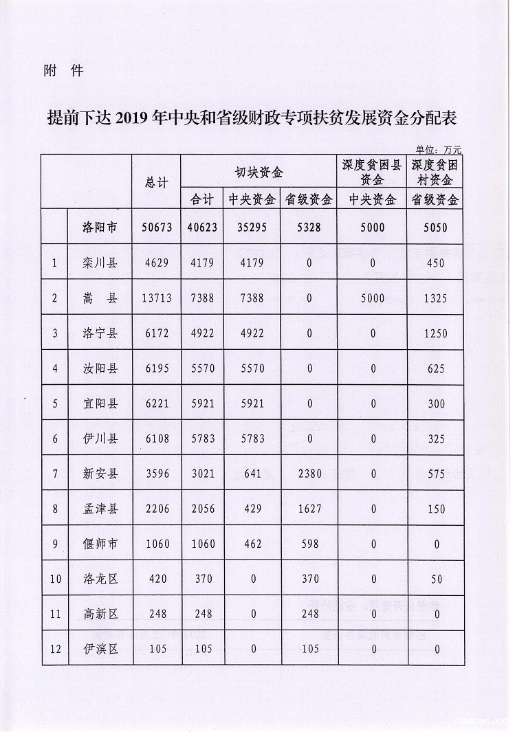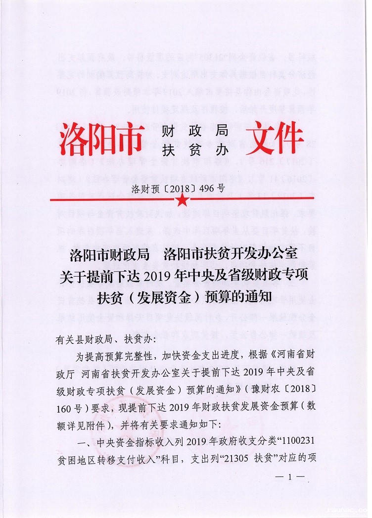 关于提前下达2019年中央及省级财政专项扶贫(发展资金)预算的通知