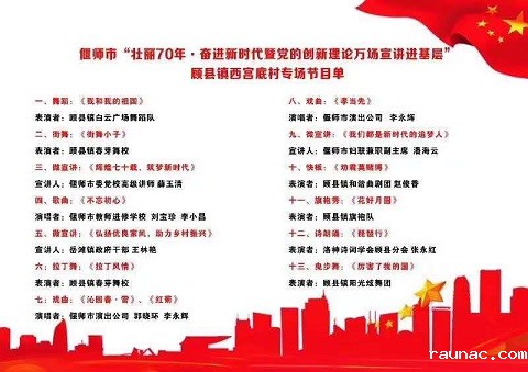 9月26日晚上,顾县镇西宫底村文化广场举办了偃师市“壮丽70年 奋进新时代暨党的创新理论万场宣讲进基层”顾县镇西宫底村专场活动。市镇优秀文化团体同台演出,顾县镇白云广场舞蹈队、春芽舞校、旗袍队、阳光炫舞团等文艺团体和个人进行了义务演出。此次宣讲巡演顺利落幕。