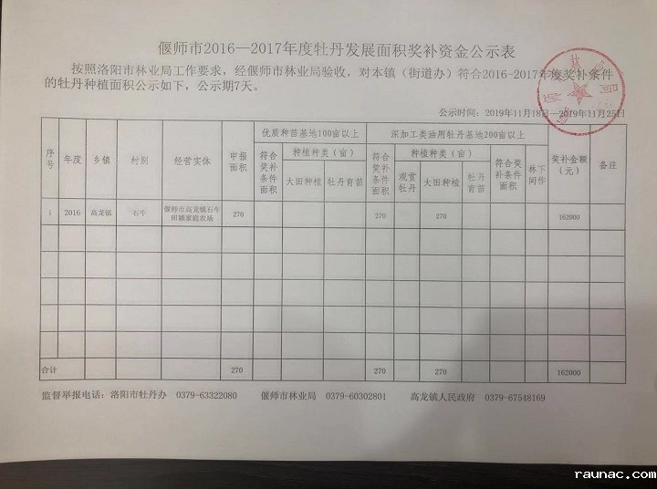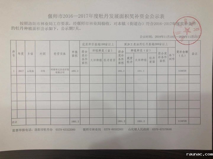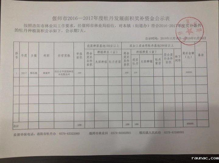 偃师市林业局关于2016-2017年牡丹种植奖补资金公示表
